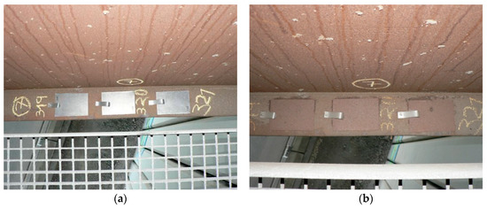 The general conditions for the development of corrosion products on typical surfaces of the bridge constructions are very similar—the bridges are situated in the same location, with just minimal differences in orientation. The design solutions are not too different from one another, either—both bridge constructions are designed as girder road bridges with upper deck. Any significant variations in the development of corrosion products on a particular typical surface of each individual bridge are thus conditioned primarily by the specific local microclimate surrounding the bridge. The decisive factor within those microclimates is the impact of road traffic under the bridge. Only bridge No. 1 is exposed to intense road traffic underneath. In addition, the abutments of bridge No. 1 stand in close proximity to the highway, which makes is somewhat similar to the so-called “tunnel-like conditions” and the associated increased deposition of chlorides on the structure [13,14,15], see Figure 4.