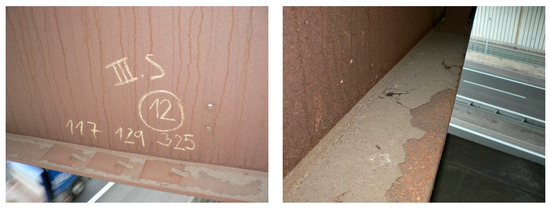 The values of thickness of corrosion layer measured on bridge No. 1 exceed the values of thickness measured on bridge No. 2. The impact of intensive road transport under the bridge and of the design creating a partial “tunnel-like effect” was most pronounced at the upper surfaces of the bottom flanges. The increased occurrence of dust deposits (including chlorides) has had a very negative influence, especially so in the case of non-ventilated internal surfaces of the bottom flanges, which do not develop a sufficiently protective corrosion layer, see Figure 8.
