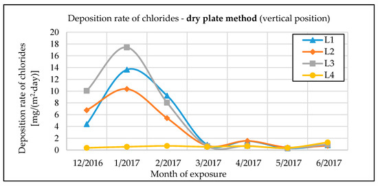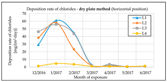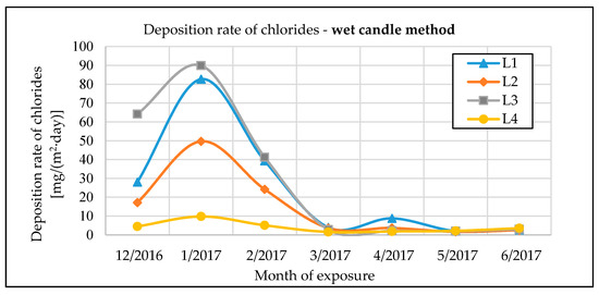 - The method used for measuring the dry deposition of chlorides significantly affects the resulting values. For most measurements, the highest chloride deposition rates are obtained using the wet candle method (maximum deposition rate measured was 90 mg·m−2·day−1). In some cases, however, the highest chloride deposition rate was measured with a dry plate method in a horizontal position. Dry plate vertical measurements provided in all cases significantly lower values when compared with other measurement methods (approximately four times less than the dry plate in the horizontal position).