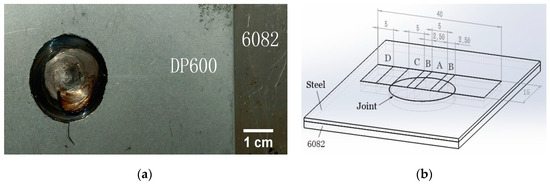 Keyhole-free FSSW joint of dissimilar 6082 aluminum alloy and DP600 galvanized steel: (a) the sample; (b) the sketch map of wire cutting.