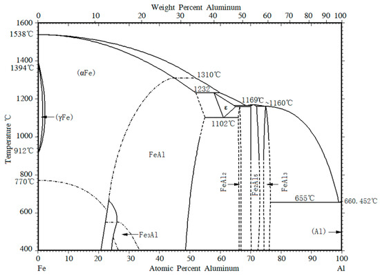 Figure 7 shows the phase diagram of the Al-Fe binary alloy, drawn by Binary Alloy Phase Diagrams Software. It indicates that the keyhole-free FSSW joints of dissimilar 6082 aluminum alloy and DP600 galvanized steel may contain the intermetallic compounds FeAl, FeAl2 and FeAl3.