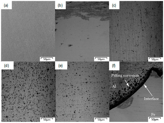 Figure 9 shows the microscopic corrosion morphology of the transverse section of different zones of 6082 aluminum alloy in keyhole-free FSSW joints before and after immersion for 96 h. Figure 9b indicates that the discontinuities of the Fe matrix were mixed in the Al matrix on the WNZ. By comparing Figure 9b–e, it can be seen that the amount of pitting was lowest on WNZ. However, HAZ had the most pitting. Furthermore, the extent of pitting on TMAZ was less than that on BM. This indicated that the corrosion resistance of WNZ was significantly better than that of BM and HAZ. The sequence of the corrosion resistance (by decreasing corrosion resistance) was WNZ > TMAZ > BM > HAZ. Figure 9f shows that serious pitting occurred in the interface of 6082 aluminum alloy, while the surface of steel had no corrosion.