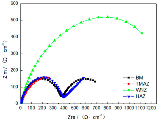 Figure 10 shows the AC impedance spectra of different areas of the transverse section of keyhole-free FSSW joints in 3.5% NaCl solution. It was found that the AC impedance spectra of different areas of the welded joints in 3.5% NaCl solution has two capacitive arcs besides WNZ in Figure 10. This was because, in the 3.5% NaCl solution, fluctuations of oxide film on the surface of 6082 aluminum alloy took place over three main steps. The first step was that metal ions (Al3+, Mg2+) left the crystal lattice in the passive film and the interface of the metal. This step, however, did not control the entire corrosion process. The second step was a mass-transfer process whereby metal ions migrated from the inside to the outside of the passive film. Finally, the third step occurred at the interface between the corrosive medium and the passive film. In the process, the new compound or passive film were formed by the combination of metal ions and anions adsorbed on the surface of the passive film. At the same time, the new compound and passive film dissolved into the corrosive medium. The passive film became thin and perforated if it is immersed for long enough. Then, the corrosion entered the stable growth stage of the pitting when the third step described above occurred. Meanwhile, the inductive components of the impedance spectrum disappeared, and the impedance was caused by a diffusion process, whereby the reaction products diffused from the solution layer close to the electrode surface to the solution. This time, there was a second capacitance arc. When corrosion time was further increased, the passive film disappeared, which resulted in only one capacitive arc in the impedance spectrum.