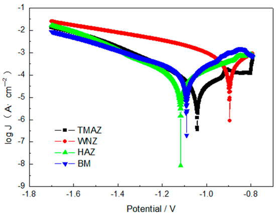 The polarization curves of different areas of the transverse section of keyhole-free FSSW joints in 3.5% NaCl solution.