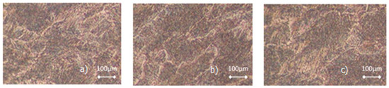 Acicular ferrite above 60 vol % in various deposits: (a) argon micro-jet cooling on the left, (b) helium micro-jet cooling in the middle, (c) gas mixture (90 vol % argon-10 vol % carbon dioxide) for micro-jet cooling on the right.