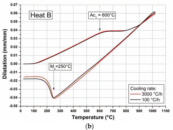 The Ms and Ac1 critical temperatures have been determined through dilatometric analysis, and relevant experimental curves for Heat A and Heat B are reported in Figure 2.