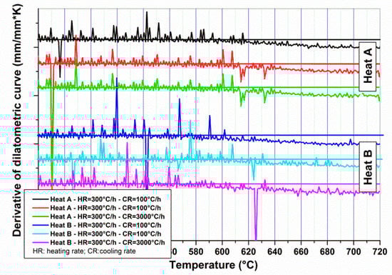 Derivatives of dilatometric curves of Heat A and Heat B samples. Different curves have been shifted to avoid overlapping and to allow a better comparison among them.