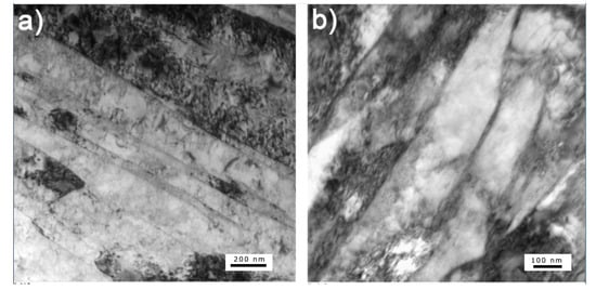 Microstructural studies have been carried out by transmission electron microscopy (TEM) using a Philips® CM12 microscope (Philips Electron Optics, Eindhoven, The Netherlands) equipped with a Bruker® Quantax TEM 200T EDX system (Bruker, Berlin, Germany). Thin foils were prepared by mechanical grinding followed by double-jet electropolishing in a solution of 10% perchloric acid and 90% butoxyethanol at 258 K (−15 °C) and 9 V.