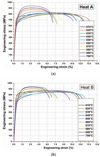 Experimental stress–strain curves of (a) Heat A and (b) Heat B after single tempering at different temperatures.