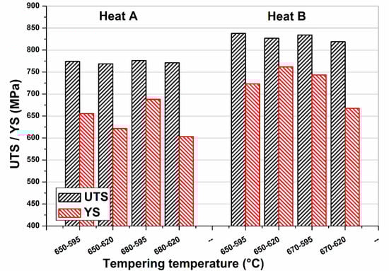 Yield (YS) and tensile (ultimate tensile strength, UTS) strengths of Heat A (red) and Heat B (black) after single tempering at different temperatures (610–700 °C).