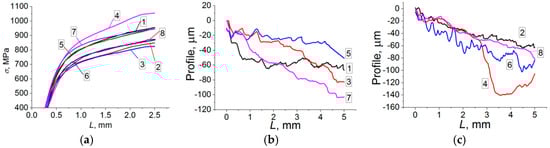 The maximum depth of the indenter penetration was 102.2 μm, while the indentation profile showed oscillations, which indicate a noticeable fraction of elastic recovery (Figure 1c, curve 6). The depth of the track increased gradually with the applied load. At a scratching distance of 4 mm, the oscillation frequency increased, which may be attributed to structural heterogeneity at the given depth. This coating possesses the lowest hardness.