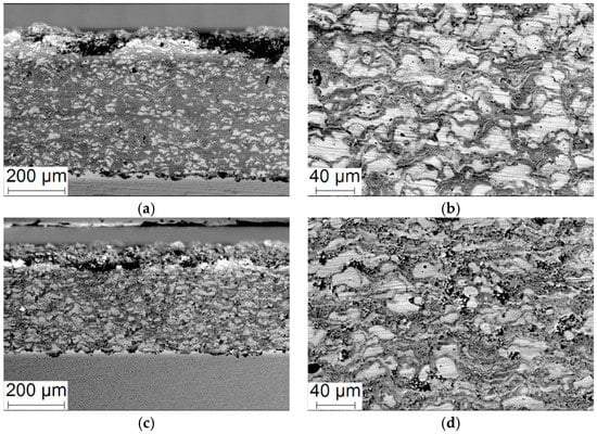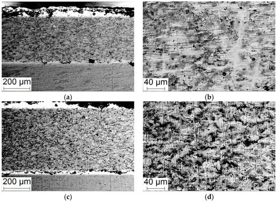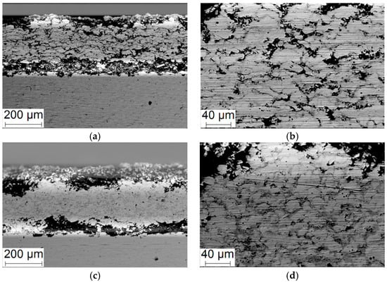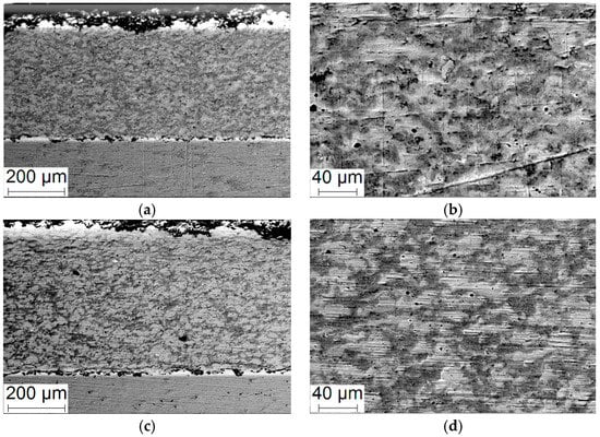 SEM-micrographs of the coating cross-section of specimens produced in regime No. 3 (a,b) and No. 4 (c,d).