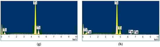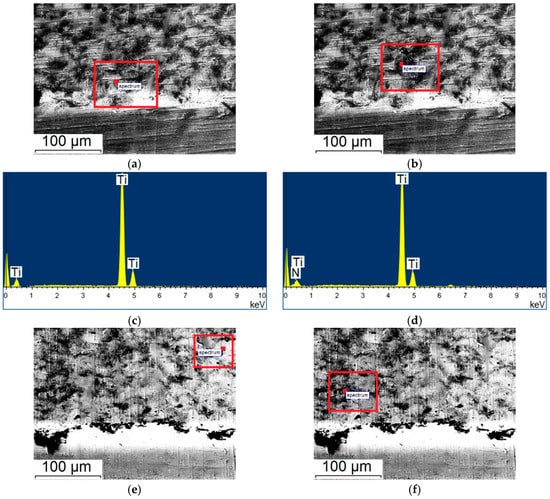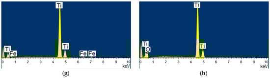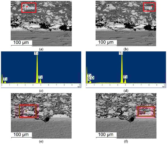 According to the EDS of specimen produced in regime No. 5, the oxygen content outside of unreacted titanium particles phases does not exceed 10%, while the content of carbon is about 20%. In the similar regions of the microstructure of specimen produced in regime No. 6, the oxygen content is about 15%, while the carbon content is 25% (Figure 7, Table 3). It can be assumed that when a longer spraying distance is used, a greater transformation degree of titanium is achieved. Therefore, the interphase boundaries appear more distinct, while the oxygen and carbon contents in specimen produced in regime No. 6 are higher (Figure 6d). Using a shorter spraying distance, a coating with increased values of nano- and microhardness was obtained (specimen No. 5, Table 2 and Table 3). As compared to specimens produced in regime No. 3 and No. 4, the nanohardness value is almost twice as high (Table 3).