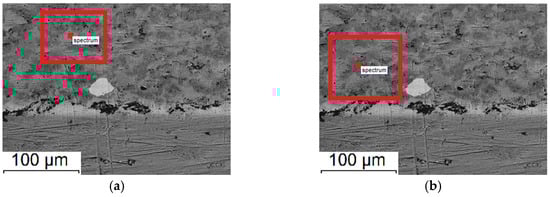 Micrographs of the coating cross-section and EDS results: specimen produced in regime No. 7 (a–d) and No. 8 (e–h). A circle within red rectangle shows the location where EDS analysis was carried out.