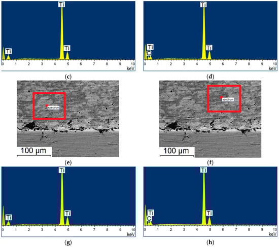 Micrographs of the coating cross-section and EDS results: specimen produced in regime No. 3 (a–d) and No. 4 (e–h). A circle within red rectangle shows the location where EDS analysis was carried out.