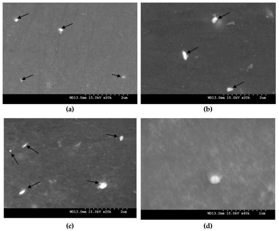 Scanning electron microscopy (SEM) images showing the distribution of Sm2O3 nanoparticles (indicated by the arrows) in Mg-Sm2O3 nanocomposites: (a) Mg-0.5 vol % Sm2O3 (b) Mg-1 vol % Sm2O3 (c) Mg-1.5 vol % Sm2O3 (d) interfacial integrity of Mg-1.0 vol % Sm2O3 nanocomposite.