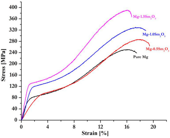 Stress–strain curves of pure Mg and the synthesized Mg-Sm2O3 nanocomposites during compression loading.