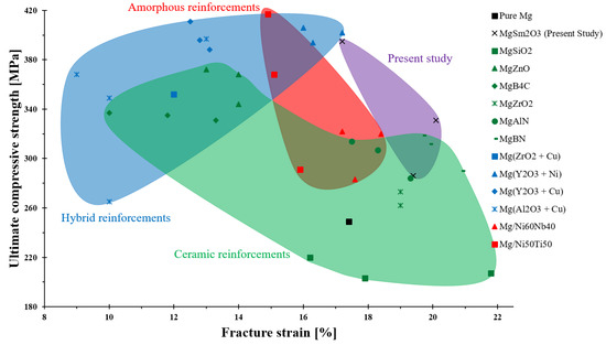 Figure 4 provides an overview of the improvements observed in UCS and fracture strain by the addition of Sm2O3 NPs to pure Mg in comparison to other ceramic, hybrid (ceramic + metallic), and amorphous reinforcements synthesized by powder metallurgy. It can be seen from Figure 4 that, Mg–Sm2O3 nanocomposites exhibited the highest UCS with better fracture strain in comparison to other ceramic reinforcements (represented by green bubble). Also, the strength values were comparable to those of hybrid (represented by blue bubble) and amorphous (represented by red bubble) particle-reinforced Mg composites. Further, it should be noted that the room temperature compressive properties of the synthesized nanocomposites are superior or comparable to the properties of commercial magnesium alloys such as AZ91, WE43, WE54, and ME21 [1,41]. The combined enhancement in both strength-ductility properties which is better than most powder metallurgy synthesized nanocomposites justifies the use of Sm2O3 as a reinforcement, and would encourage researchers in the Mg community to further study its behavior and suitability for various commercial applications.