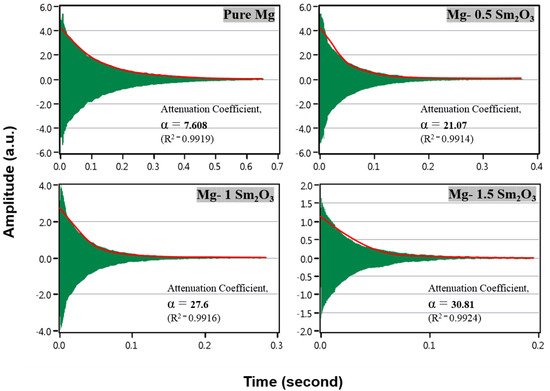 where, “t” is the time after removal of the external force, “A0” denotes the amplitude at t = 0, “α” represents the attenuation (damping) coefficient (which depends on the damping capacity of materials), and fr denotes the resonant frequency. Here, in the case of the Mg-Sm2O3 nanocomposites, various vibration modes are excited, and therefore we cannot obtain the attenuation coefficient by fitting Equation (3) to the vibration–damping curve. In order to determine α in such a case, the maximum value of positive amplitude of the damping curve has been picked up and fitted according to the following equation: