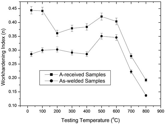 Work hardening index (n) values of the as-received and as-welded samples tested at different temperatures.