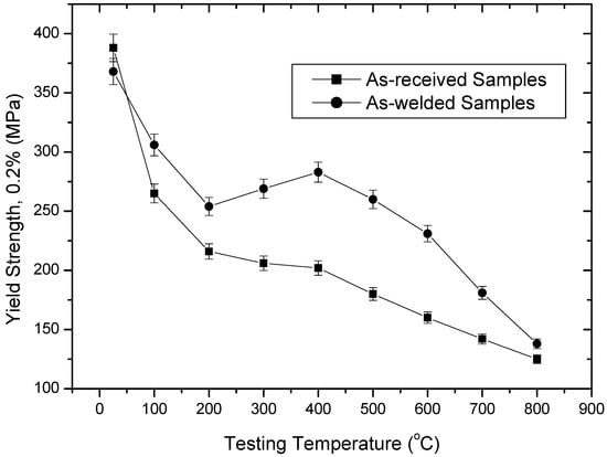 This is also confirmed in Figure 3, where YS is graphed against testing temperature. As seen in Figure 3, there is a decrease in YS values of as-welded samples with increasing temperature, reaching a minimum at 200 °C; it then increased with increasing temperature and reached a maximum at 400 °C. This indicates the presence of C and/or N in solid solution, where they would make dislocation movement more difficult. YS values changed drastically beyond 600 °C. However, as-received samples revealed a decrease in YS value up to 400 °C, after which it decreased too fast. This also suggests that DSA is more operative in as-welded samples than as-received samples at the test temperatures of 25–800 °C.