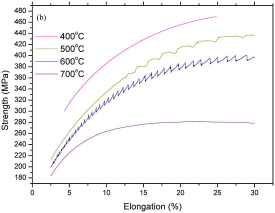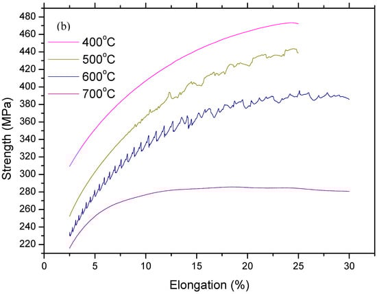 Figure 4 and Figure 5 show stress and strain diagrams for as-received and as-welded samples in the temperature range of 25–800 °C. As can be seen, the stress and strain diagrams showed significant changes in appearance when the testing temperature was increased for the strain rate of 1 × 10–3 sn−1. Serrated yielding, which is a characteristic of DSA, was clearly seen in as-received and as-welded samples at testing temperatures of 500 °C and 600 °C. The serrations disappeared from the curves at higher temperatures of 700 °C and 800 °C. Such serrated behaviour is shown by a plateau in the variation of strength and a minima in the variation of elongation. Deformation rate and temperature, which affect the diffusing solute atoms and the velocity of mobile dislocation, play a very important role for DSA. At a high deformation rate and low temperature, the diffusion of solute atoms is slower than dislocation for the occurrence of strain ageing. However, at a low deformation rate and high temperature, solute atoms can move with the dislocations resulted of DSA disappear. Therefore, DSA can be observed in the temperature range of intermediate strain rates [,].