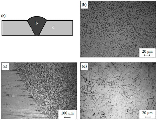 SEM micrographs of (a) schematic representation of welded joint; (b) weld metal; (c) heat-affected zone (HAZ) and (d) base metal.
