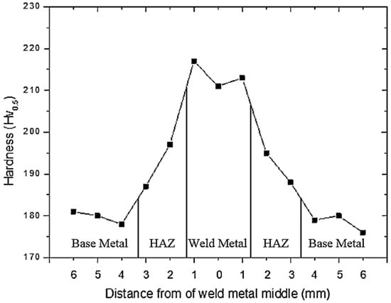 Figure 7 shows Vickers microhardness measurement of the base metal, HAZ and weld metal. It was observed that the highest hardness was obtained in the weld metal. This could be the presence of a higher amount of Cr in solid solution due to welding thermal cycle. It was shown that higher Cr content in the weld metal increases hardenability of steel []. This is consistent with the results obtained by Hee-jin and Hae-woo [] who investigated effects of Cr content on microstructure and mechanical properties of low carbon steel welds. Higher hardness in weld metals may also be owing to melting and solidification of the area during or cooling after welding. Generally, as-welded samples revealed the lowest and highest hardness in the base metal and weld metal respectively. Hardness of HAZ was found to be higher than base metal, but lower than weld metal.