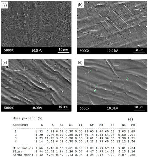 The results obtained from the present study suggest that the martensite develops at the shear bands. Ren-bo et al. [] indicated that 316L austenitic stainless steel has low stacking fault energy (64 mJ/m2), and a low stacking fault energy is generally related to higher susceptibility to martensite transformation. Many parallel shear bands can be seen in Figure 8b–d for the samples tested at 200 °C, 400 °C and 600 °C. Figure 8 also shows EDS analysis with the spectrum points 1, 2, 3 and 4 marked on the microstructure of samples tested at 600 °C. Points 1 and 2 contain Fe, C, Cr and Mo, but point 3 contains Fe, C, Cr, O and Mo. The presence of these elements indicated that (Cr,Mo)C and CrO occurred during testing or cooling after testing at 600 °C in which the sample showed serration behaviour.