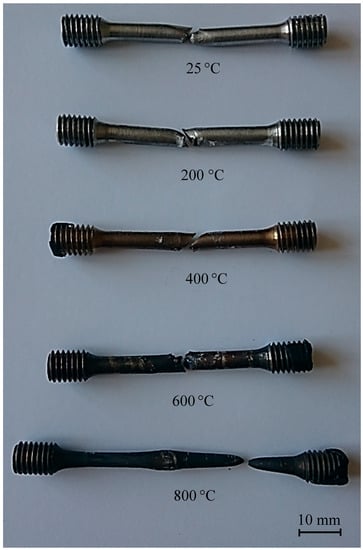 The fracture characteristics of tensile test samples were analyzed in the present experimental work. The macrographs of the as-welded samples are shown in Figure 9. The results revealed that the fracture formed in the HAZ of as-welded samples tested at 25–600 °C. The fracture of the as-welded samples tested at temperatures of 25–600 °C started from adjacent to the fusion zone in the HAZ and continued through into the weld metal. The strains developed during the thermal cycle of welding in the HAZ region is primarily responsible for starting fracture []. Due to strains, the grain growth in the HAZ next to fusion line can encourage to the starting failure from this region. However, the fracture in as-welded samples tested at 700 °C and 800 °C occurred in the base metal.
