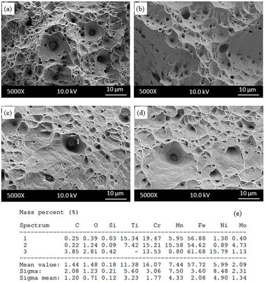 To show the fracture type after the tensile test, the fractured specimens were examined using SEM. Figure 10 and Figure 11 show fracture morphology of the as-received and as-welded samples respectively for the testing temperatures of 25–600 °C. The fracture surface of as-received and as-welded samples tensile tested at 25 and 200 °C showed ductile dimple fracture which is characteristic of ductile fracture. This indicates a ductile fracture mode with microvoid morphology, which is associated with the nucleation, growth and coalescence of microcavities []. At 400 °C and 600 °C, as-received and as-welded samples revealed mixed type fracture of cleavage facets and dimples. The reduction in area is also decreased at the same temperatures of 400 °C or 600 °C, which suggests that DSA occurs in the 316L austenitic stainless steel under as-received and as-welded conditions. However, as-welded samples showed lower decrease in area than as-received samples, owing to DSA. On the other hand, ductile dimples were found in as-received and as-welded samples after testing at 800 °C, which led to the increase in elongation and reduction in area. Some inclusions in small holes were seen on the microfractographs of as-received samples (Figure 10c) and as-welded samples (Figure 11d). The EDS analysis showed the presence of complex Mn-Cr-Ti-Al inclusions in both as-received and as-welded samples.