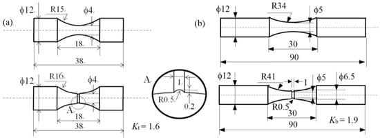 Steel slabs were vacuum-melted, hot-forged, and hot-rolled into 13-mm-diameter bars. The chemical composition of these steel slabs is provided in Table 1. For the torsional and rotational bending fatigue tests, smooth and notched specimens (dimensions shown in Figure 1) were machined from the bars. The stress concentration factors of the notched specimens were estimated to be 1.6 for torsion and 1.9 for bending using the data of stress concentration factors numerically calculated by Nishitani [28]. Smaller net areas of torsional smooth and notched specimens than those of bending specimens are caused by the lower power of the torsional testing machine.