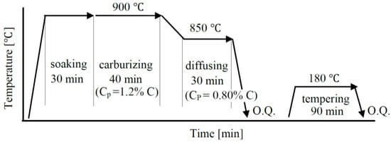 The specimens were subjected to vacuum carburization and quenching in oil at 80 °C followed by tempering at 180 °C for 90 min (Figure 2) in a vacuum-carburizing batch furnace (VCB, IHI Machinery and Furnace Co., Ltd., Tokyo, Japan). For comparison, commercial JIS-SNCM420 steel bars of 13-mm in diameter and with the chemical composition given in Table 1 were prepared, and the vacuum carburization and tempering process was carried out on smooth and notched specimens having the same dimensions as the TM steel. In addition, TM and SNCM420 steels subjected to quenching and tempering heat treatment [18] were also prepared.