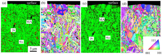 (a,c) Phase and (b,d) orientation maps of cross-sectional side view of surface-hardened layer of the smooth specimens of as-vacuum carburized (a,b) TM and (c,d) SNCM420 steels. Yellowish green, gray, and red regions represent α′-martensite matrix (αm), MA-like phase (MA), and retained austenite (γR) phases, respectively.