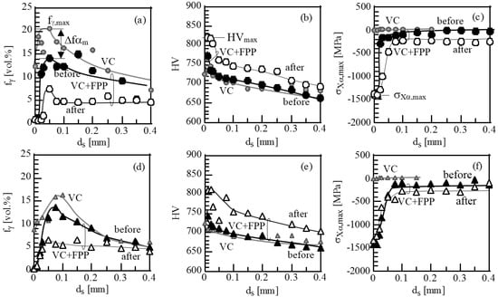 Variations of (a,d) volume fraction of retained austenite (fγ), (b,e) Vickers hardness (HV), and (c,f) residual stress (σXα) as a function of depth from surface (ds) in (a–c) TM (●○) and (d–f) SNCM420 (▲△) steels subjected to vacuum carburization and fine particle peening (VC+FPP). Solid (●▲) and open (○△) marks represent before and after torsional fatigue tests, respectively. Gray marks denote the properties of TM (●) and SNCM420 (▲) steels subjected to vacuum carburization (VC).