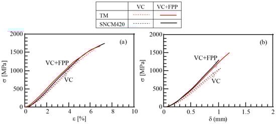 (a) Engineering stress−strain (σ–ε) curves of smooth specimens and (b) engineering stress-displacement (σ–δ) curves of notched specimens in TM and SNCM420 steels subjected to vacuum carburization (VC) and subsequent fine particle peening (VC + FPP).