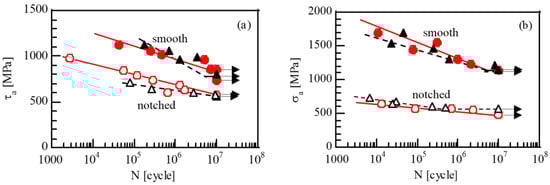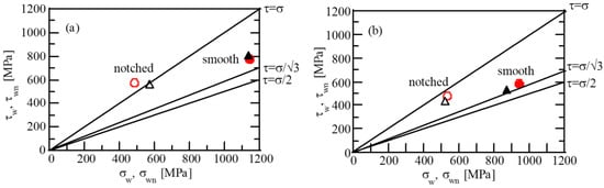 The relation regarding the notched specimens was represented using the maximum principal stress criterion, i.e., τ = σ (τ, shear stress; σ, normal stress). The idea that the relations for notched specimens are given by the maximum principal stress is not sufficiently demonstrated. It probably depends on the stress concentration factor. For lower stress concentration values, the relation is expected to be close to the smooth case, and for higher stress concentration factors, no conclusions can be drawn. We do not know if the same criterion is adequate.