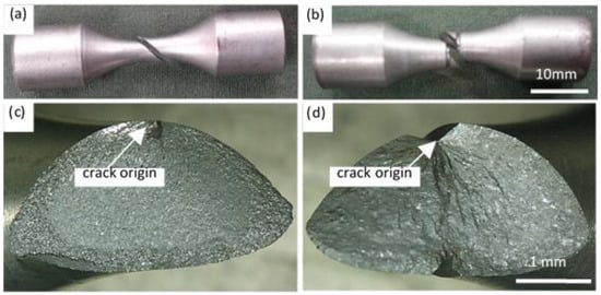 Fatigue tests were conducted using a torsional fatigue testing machine (PBF-30X, Tokyo Kikai Seisakusho, Ltd., Tokyo, Japan) at 25 °C with a sinusoidal wave of 25 Hz at a stress ratio of R = −1, and a rotating bending fatigue testing machine (H-7, Shimadzu Co., Kyoto, Japan) at 25 °C with a sinusoidal wave of 3000 rpm and a stress ratio of R = −1. The fatigue limit was defined as the maximum value of the stress amplitude without failure for up to 1.0 × 107 cycles. To calculate the nominal torsional and bending stresses for notched specimens, net area was adopted for the notched specimens.