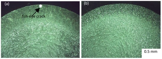 In all torsional specimens subjected to vacuum-carburization and fine particle peening, crack origins leading to fatigue fracture were observed on the surface (Figure 7). On the other hand, the rotational bending smooth specimens of vacuum-carburized and fine particle peened TM steel fractured in a fish-eye crack pattern at the subsurface region (at a depth of less than 50 μm from the surface) (Figure 8a), although surface crack fractures were occasionally observed. This may be associated with a difference in the stress state (in the torsion and uniaxial tension). No distinct fish-eye cracks were observed in the fracture surface of the rotational bending notched specimens of the TM steel (Figure 8b). Non-propagating cracks were not observed on the surface of any of the non-fractured specimens tested in terms of torsional and rotational bending. According to Sugimoto et al. [11], only surface crack fractures have been observed in all heat-treated specimens subjected to fine particle peening [17,18].