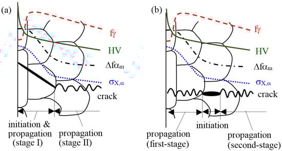 In general, fine particle peening increases the (i) hardness and (ii) compressive residual stress in the surface-hardened layer of heat-treated and carburized steels through severe plastic deformation and strain-induced martensite transformation of retained austenite [10,16,19,21,22,23,24,25,26,31]. In addition, the peening produces a small surface roughness. If a fish-eye crack initiates at the subsurface layer of the specimen and subsequently propagates to the surface [33], as shown in Figure 10b, the subsurface-hardened properties characterized by (i) and (ii) suppress the propagation to the surface (first-stage propagation) of the fish-eye crack, as well as in case of crack initiation on the surface (Figure 10a). Therefore, the surface-hardened layer properties and the depth of the crack initiation origin can be expected to be connected with the fatigue limits and the relation between the torsional and rotational bending fatigue limits in the smooth specimen of TM steel subjected to vacuum carburization and subsequent fine particle peening.