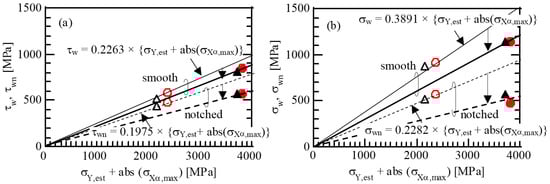 Variations in (a) torsional (τw, τwn) and (b) rotational bending fatigue limits (σw, σwn) for smooth and notched specimens as a function of the sum of estimated yield stress and absolute value of maximum compressive residual stress {σY,est + abs(σXα,max)} in TM (●○) and SNCM420 (▲△) steels subjected to vacuum carburization and subsequent fine particle peening (●▲, thick lines ) and heat-treatment and subsequent fine particle peening (○△, thin lines).