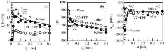 Variations of (a) volume fraction of retained austenite (fγ), (b) Vickers hardness (HV), and (c) residual stress (σXα) as a function of depth from surface (ds) in TM (●○) steel subjected to vacuum carburization and fine particle peening (VC + FPP). Solid and open marks represent before and after rotary bending fatigue tests, respectively. Gray marks (●) denote the properties of as-vacuum-carburized TM steel (VC).