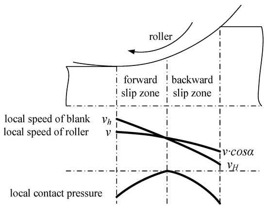 where represents the local wear intensity, that is, wear volume per unit area over the sliding distance S; is the wear coefficient which depend on the contact surface conditions, such as surface roughness, and the materials properties including the hardness of the materials; and are the exponent coefficients for contact pressure and sliding distance , respectively. Hence, understanding the rolling contact condition is a vital step for studying wear. The local contact pressure and localized sliding depends on the shape, the material and the relative motion of the contact pairs. For a rolling process, the contact response is complex because the blank is an elastic-plastic part, and the roller is an elastic part if ignoring the small plastic deformation. The slab method is essential way for analyzing the contact and deformation of rolling process [13,14,15]. It is generally believed that the rolling bite, that is, the rolling contact area, can be divided into the forward slip zone and backward slip zone, as illustrated in Figure 1. The roller’s local tangential speed is smaller than the local speed of the blank in the forward slip zone, which is opposite in the backward slip zone. Dong and Song [16] studied the slip in bar rolling and found that the difference between the roller’s and blank’s speeds induces local sliding. Kazeminezhad and Taheri [17] analyzed the contact pressure in wire flat rolling, the local contact pressure distributed as a hill with the peak occurring at the neutral plane. The local sliding and normal load cause local wear of the roller.