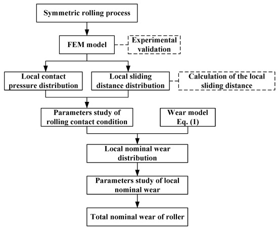 This paper used finite element analysis to study the local contact responses and wear of roller in a symmetric rolling process. The flowchart of the study is showed in Figure 2. Firstly, an FEA model was established and validated for a plate rolling process. Secondly, the local contact pressure and local sliding distance over rolling bite were obtained based on numerical results, and the effects of rolling parameters were investigated. Thirdly, the local nominal wear of rolling bite and total wear over the roller were studied based on the wear Equation (1). Finally, the nominal wear distribution over rolling bite and the total wear of roller were investigated.