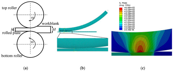 Rolling process and finite element model for simulation. (a) Schematic of a plate rolling process, (b) simplified Finite Element Analysis (FEA) model of the rolling process, (c) von Mises stress from a rolling process simulation.