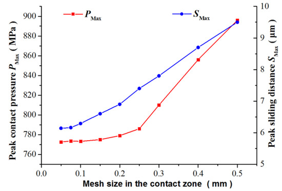 Mesh convergence check for both peak contact pressure and peak sliding distance over the rolling bite.