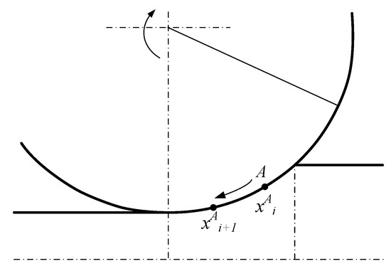 According to Equation (1), the local contact pressure and sliding distance are two important parameters for wear estimation. The sliding displacement begins to accumulate from the entrance section to the exit section. In order to calculate the wear of the roller, the sliding distance of each roller surface node over rolling bite must be determined. However, the simulation result only provides the accumulated sliding displacement in contact surface. Pereira et al. [7] provided a method for calculating the sliding distance with the variation of time-increment. In the plate rolling process, the rolling parameters and the geometrical parameters of rollers and blank are unchanged. Hence, the shape of the rolling bite keeps a steady state, and local contact condition over rolling bite remains unchanged, which can be referred to calculate the local sliding distance with the variation of node number in the steady-state rolling process, as shown in Figure 6. In a rolling cycle, an arbitrary material point on the roller surface experiences the sliding against the plate surface, which causes wear at point . The local sliding distance , in a short way , of the material point A can be calculated based on the difference of the accumulated relative sliding distances to against the contacting plate surface when it moves corresponding to finite element node to the next location of the finite element node within the time increment of in a steady state rolling process. If the angular velocity is and the angular distance between nodes and i is , the time increment is . If the local contact pressure , the local sliding distance ; otherwise the local contact pressure should be , and the local sliding distance . To ensure the consistence of the time increment for calculating the local sliding distance for all the material points on the roller, uniform element size on the contact surfaces in the finite element model is required. Additionally, considering the numerical floating error in a computational simulation, the local sliding distance is treated as zero if a calculated local sliding distance is less than is 0.05 μm, which is one-thousandth of the mesh size on the rolling bite. This treatment is also necessary to clearly define a stick zone as discussed in next section.