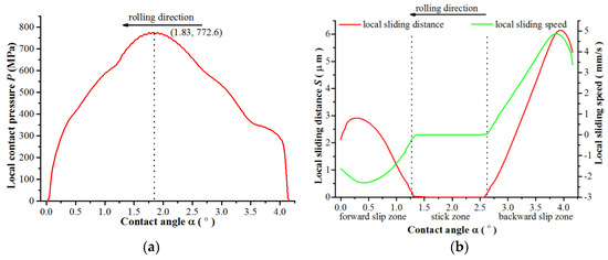 Distribution of local contact pressure (a) and local sliding (b) over the rolling bite.