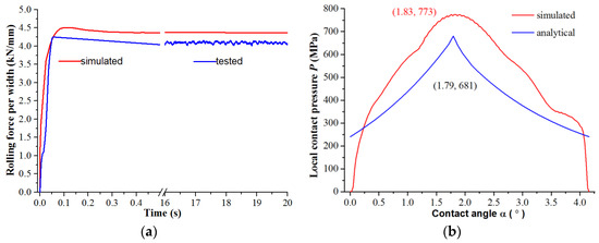 It’s difficult to accurately measure the local contact pressure and sliding distance by experiment. In order to validate the FEA model, firstly the simulated rolling force was compared with the experimental rolling force, as shown in Figure 8a. The rolling forces of the simulation and test reach peak values rapidly during the transient state. After that, the rolling force becomes a constant value during the steady-state rolling process. The simulated steady rolling force is only 6.9% bigger than the rolling force of the measured value. In addition, an analytic result of local contact pressure was compared with the simulated results, as shown in Figure 8b. The Karman equation is an analytic method for calculating the local contact pressure [19]. The theory divided the rolling bite into forward and backward slip zones, and the local contact pressure in forward and backward slip zone were calculated by Equation (2a,b), respectively.