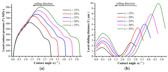 Contact pressure (a) and local sliding distance (b) distribution over the rolling bite with different thickness reduction (other parameters were constant with = 1.5 mm, = 190 mm, = 0.25, AZ31, A532M).